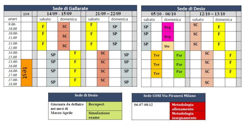 Il Test di ingresso, le lezioni di Tecnica schermistica (44 ore), di Regolamenti (2 ore), Scherma storica (1 ora), Scherma paralimpica (2 ore) e le lezioni di Metodologia dell’Insegnamento (12 ore) e Metodologia dell’Allenamento (12 ore), a cura di Docenti docenti designati F.I.S./Scuola Regionale dello Sport del C.O.N.I. si svolgeranno in sede alternata presso le strutture messe a disposizione dalla Accademia Scherma Gallaratese a.s.d. – Viale Europa Ang. Via Gran Bretagna 21013 Gallarate (VA) e dalla Scherma Desio ssdrl – Via S. Caterina 13, 20832 Desio (MB).